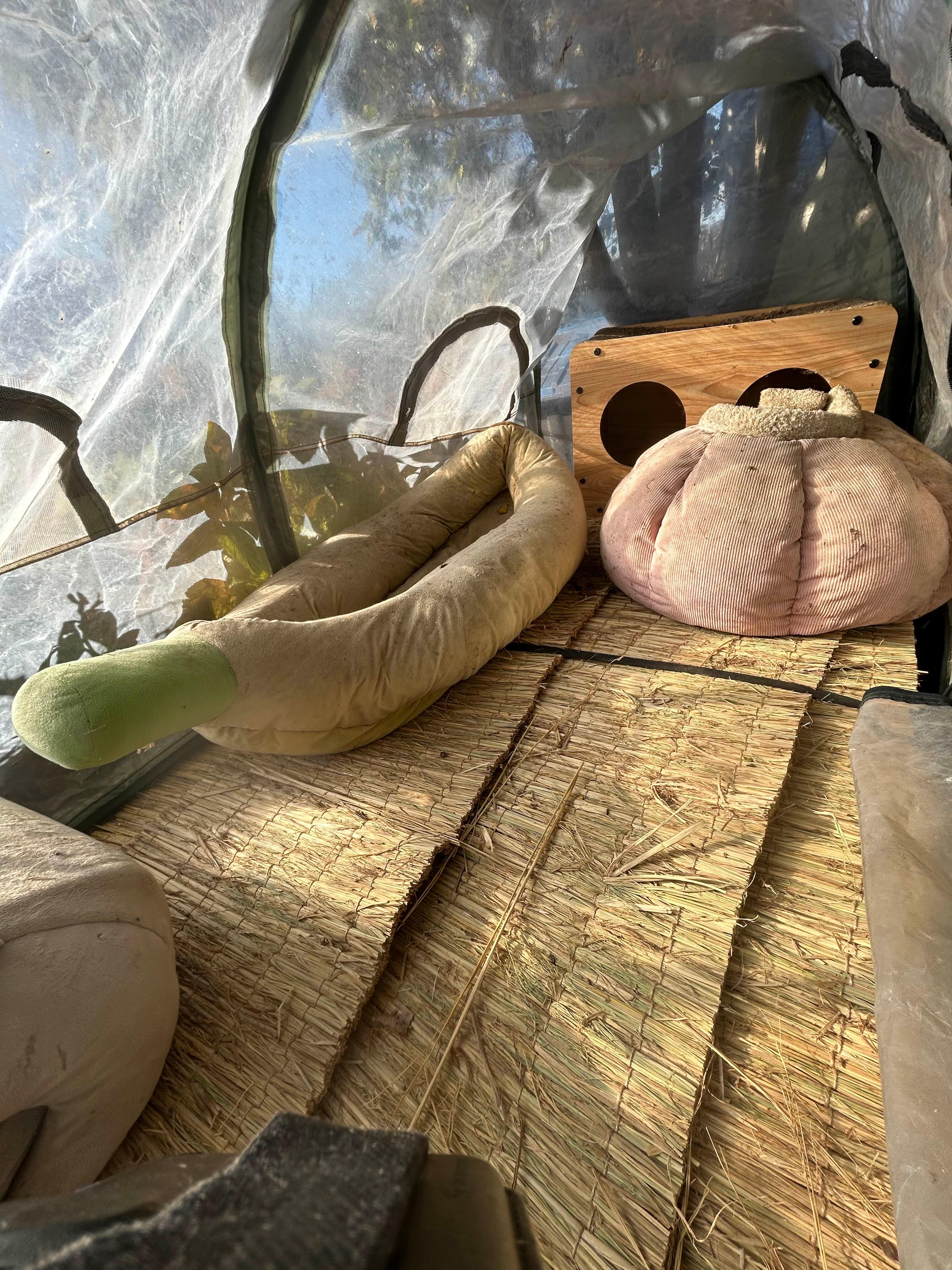 스텐 작업대를 치우고 그 근처를 싹 정리한 다음 여기저기 굴러댕기는 나무 파레트 두 개를 나란히 놓고 그 위에 볏짚을 두텁게 깔고