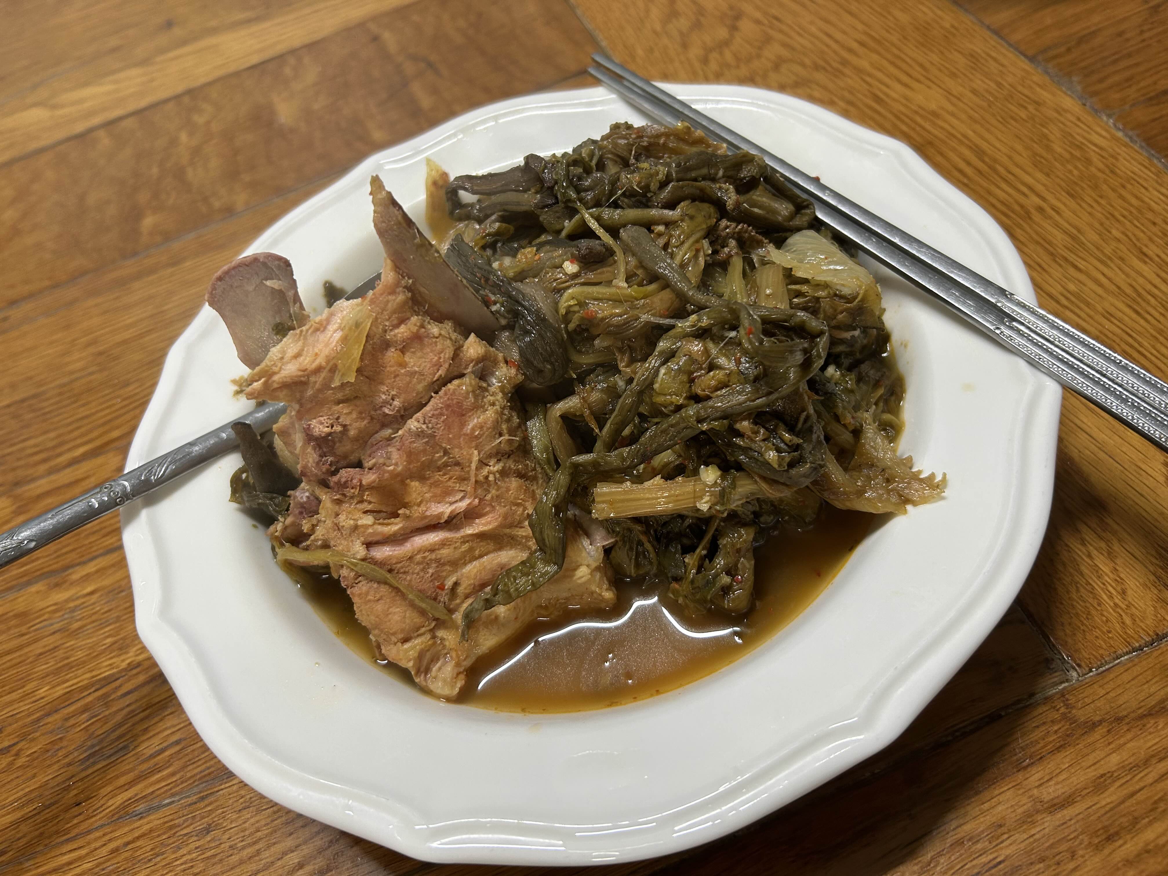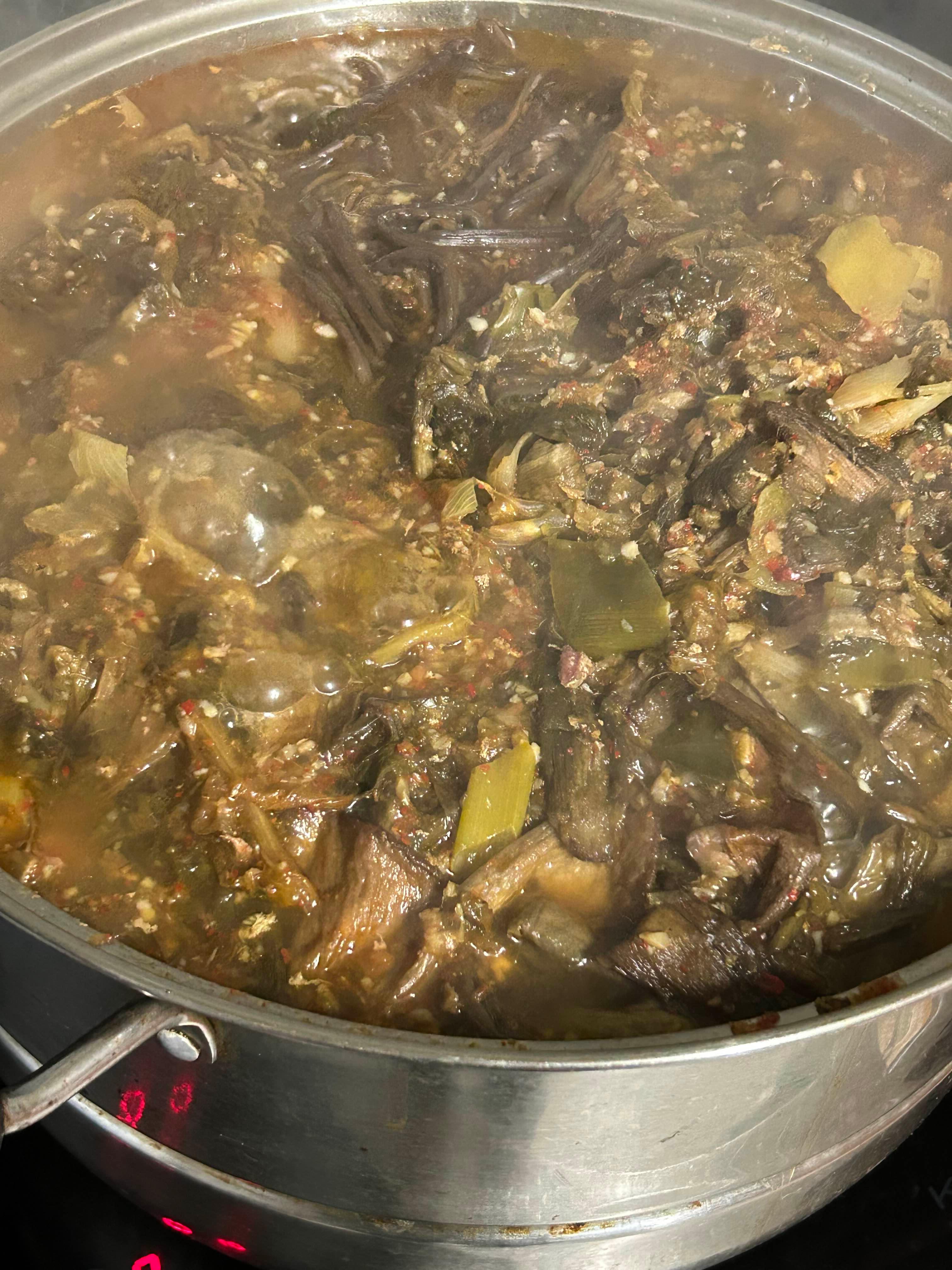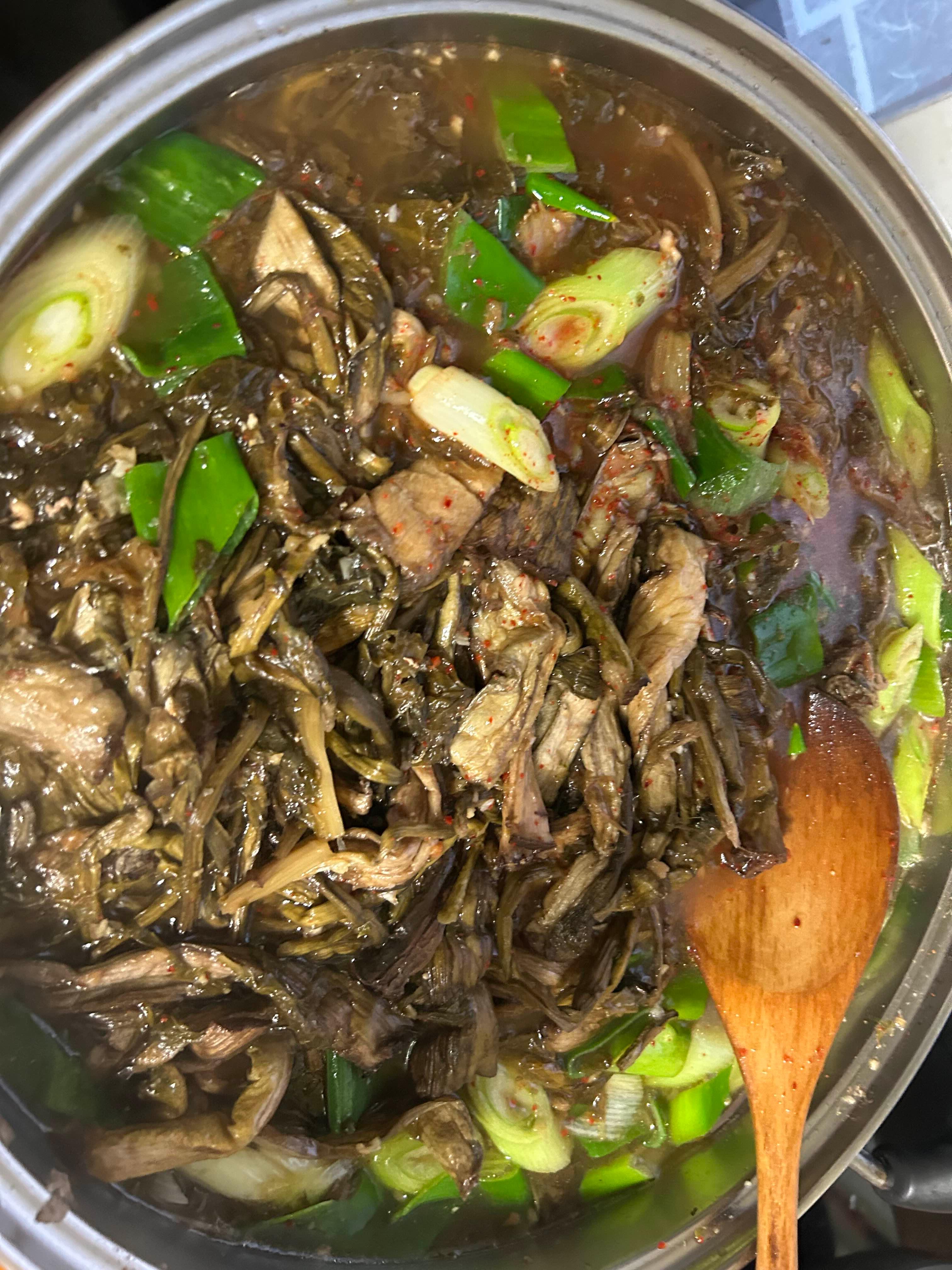 등뼈를 푹 삶은 국물에 무시래기랑 토란대랑 고구마줄기랑 고사리랑 한 뭉터기씩 넣고 대파 숭숭 썰어넣고 마늘 한 국자 퍼넣고 김장양념 두 국자 넣고 멸치액젓이랑 간장으로 간을 하고 매실액 조금 넣고 푹푹 끓이고 있다.
