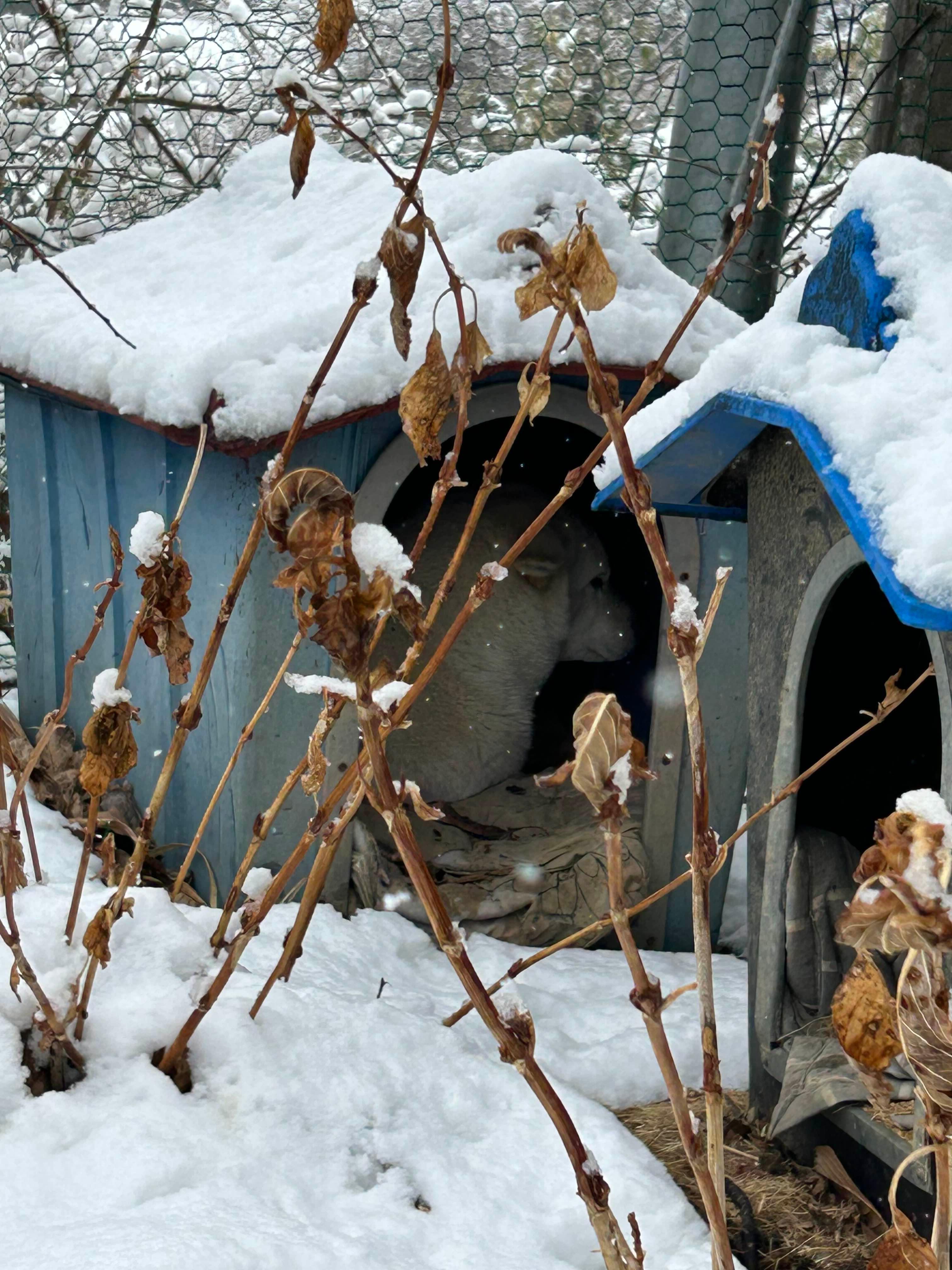 꼭 눈이 내리면 봉덕이는 개집에 들어간다.