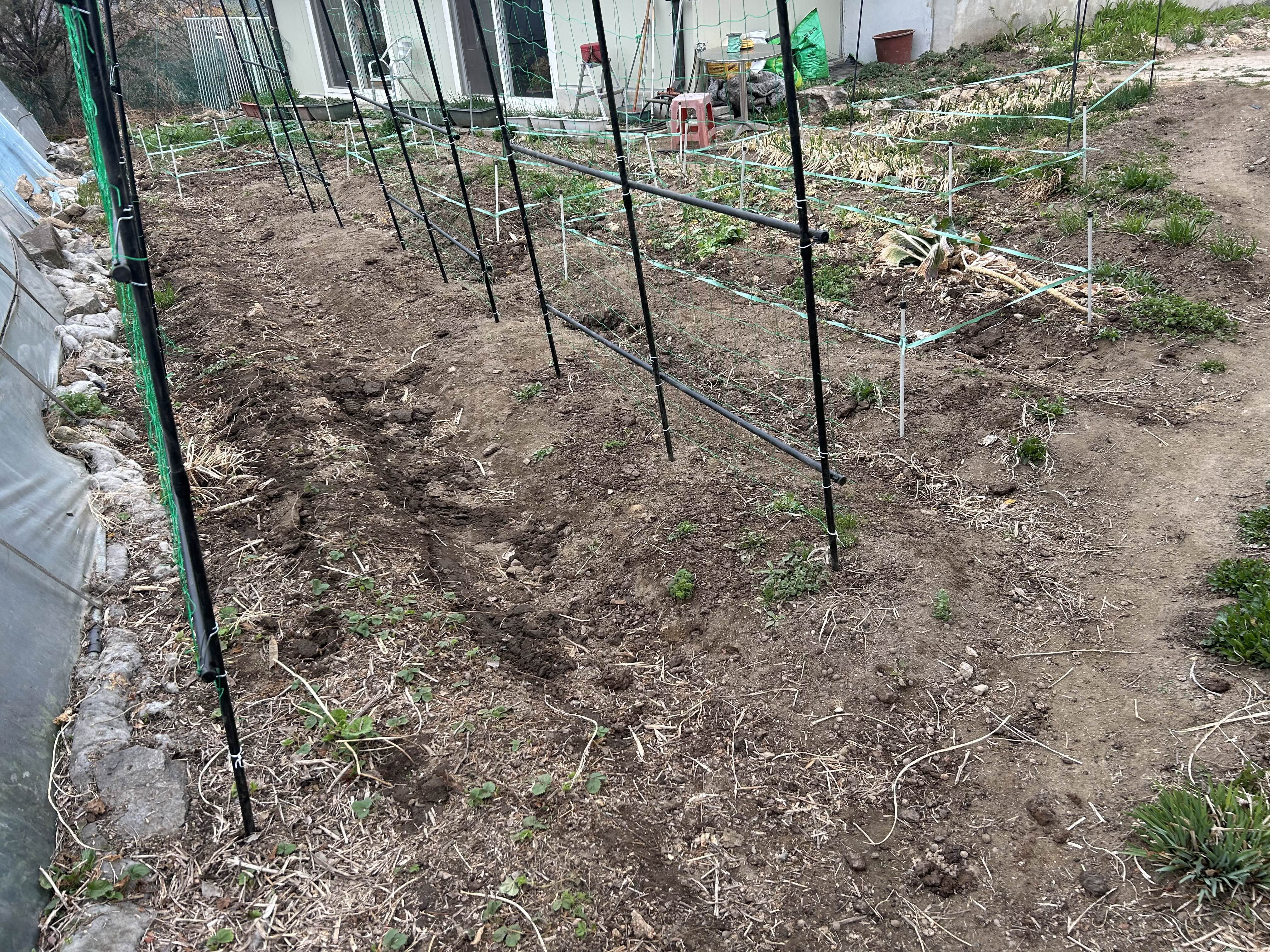 그러다 나머지 밭에 쿠바식 상자 틀밭을 만들려고 대충대강 말목 박고 노끈으로 구획을 정리해놨다.