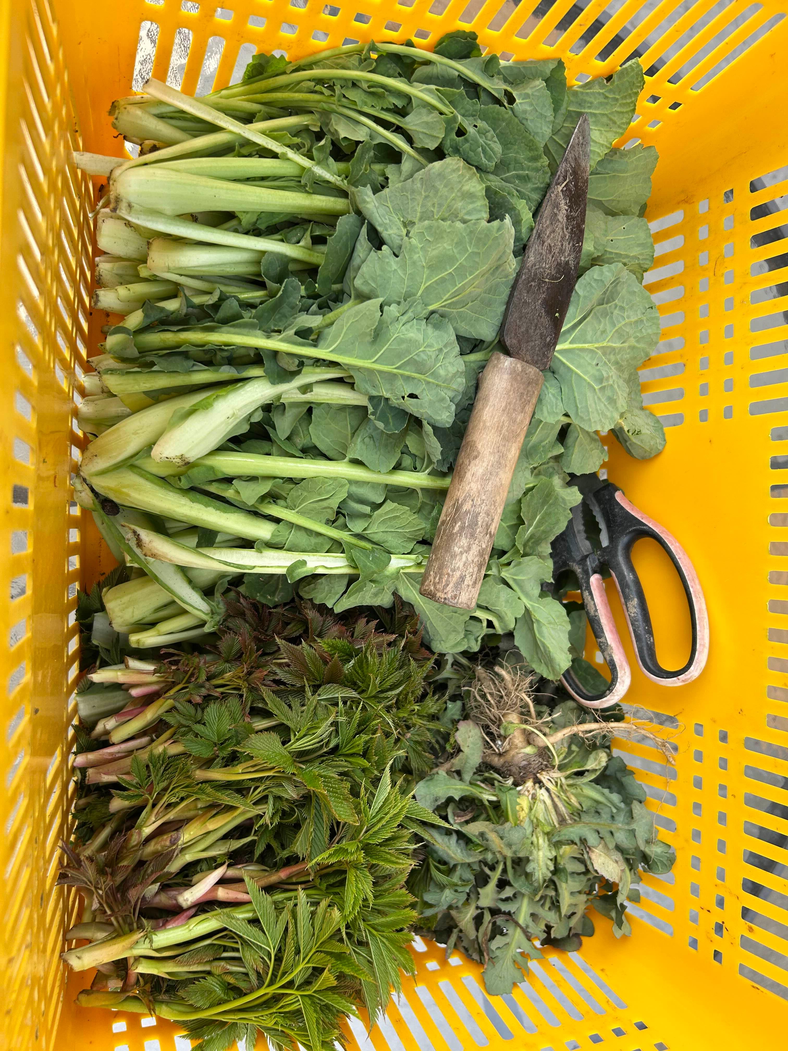 낮에 잠깐 쉬었다가 나물칼이랑 바구니 들고 나가서 부지깽이나물 눈개승마 산마늘 쪽파 삼동추 야생고들빼기 등등 요즈음 나오는 나물들을 캐고 뜯고 했다.